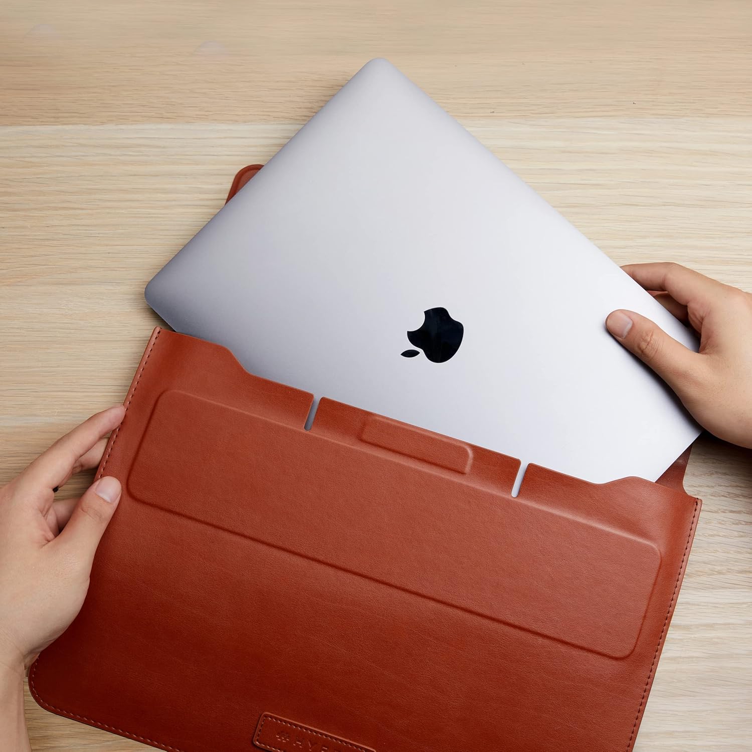 The HyperShield Stand & Go sleave for macbook pro Laptop Sleeve laptop cover for macbook pro in Tan is a slim, protective laptop case that flips up, transforming into an ergonomic laptop stand, providing you with a pleasant 15-degree typing and viewing experience no matter where you are. This case bag for macbook is compatible with any 15”-16” MacBook Pro. Our high quality vegan leather provides the appearance and feel of real animal leather, but it’s free of any animal skins. The secure magnetic cover locks in place ensuring your MacBook stays protected when on-the-go. This sleeve case for macbook pro has a durable exterior provides ample protection for your MacBook against scratches, dings, and minor wear and tear. Designed for maximum portability, this portable laptop stand is incredibly lightweight and easy to carry. It elevates your laptop allowing for better heat dissipation. HYPER creates award-winning, cutting-edge IT and mobile accessories that focus on compatibility with Apple, portable power, and connectivity.
